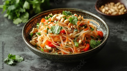 a close-up shot of a delicious Thai papaya salad served in a bowl