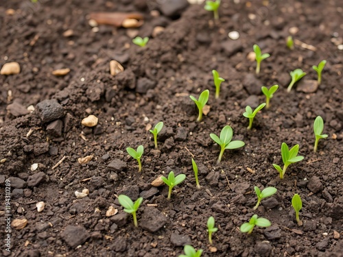A close-up shot of a field covered in freshly sprouted seeds, symbolizing new beginnings and growth, fresh, farming