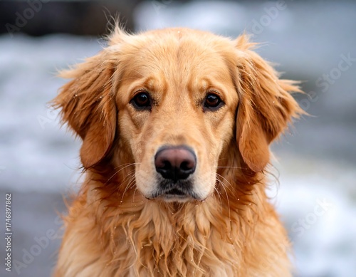 A close-up shot of a golden-haired canine with brown eyes, staring directly at the camera. The background is blurry