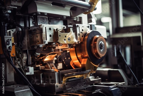 machine, industrial, manufacturing, unit, closeup, action, intricate, part, bustling, metalwork, industry, machinery, production, automation, technology, equipment, engineering, precision, detail, workbench, metallic, gear, lever, buttons, control panel, steel, operator, safety, quality control, assembly line, conveyer belt, heavy machinery