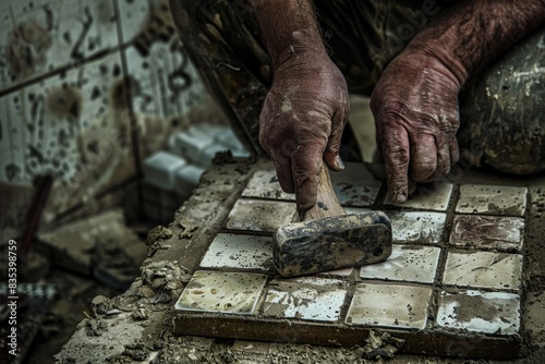 A close-up shot of a person holding a hammer and applying it to a tile, with a focus on the action