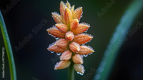 A close-up shot of a plant's flower head, adorned with water droplets, against a green stem background