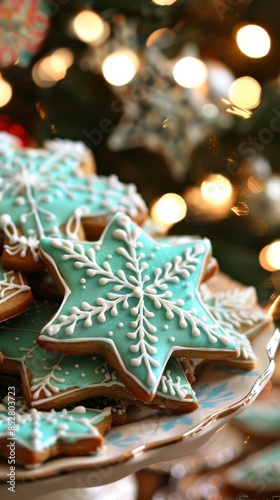 A close-up shot of a plate of homemade Christmas cookies, shaped like stars and decorated with white icing and snowflake designs, against a blurry background of lights and a Christmas tree. The cookie