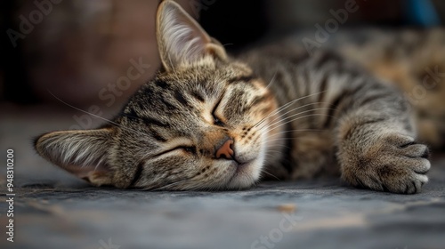 A close-up shot of a tabby cat lying peacefully on a textured surface. The cat is asleep, with its eyes closed and its paws curled up. The soft fur, the delicate whiskers, and the relaxed posture of t