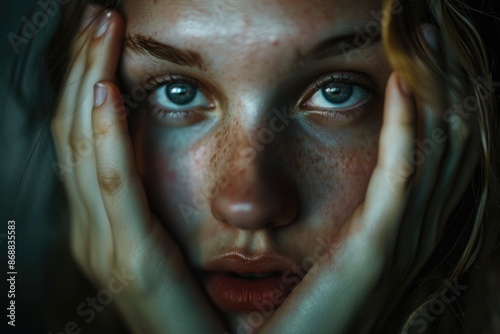 A close-up shot of a woman's face with noticeable freckles