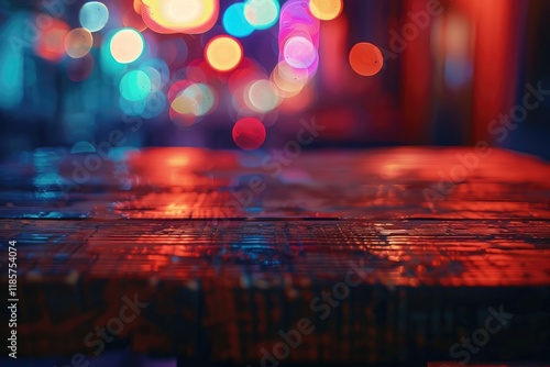 A close-up shot of a wooden table with a blurred bokeh background, featuring neon lights and a dark interior setting.