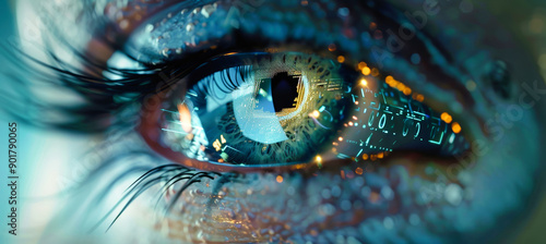 A close-up shot of an eye with digital data displayed on the iris, capturing the essence of cyberpunk aesthetics
