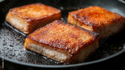 A close-up shot of crispy pork belly with fish sauce glistening in the light, showing the rich texture of the crispy skin and tender meat beneath.
