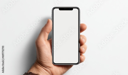 A close-up shot showcasing a hand holding a sleek, modern smartphone with a blank, white screen against a plain, bright background