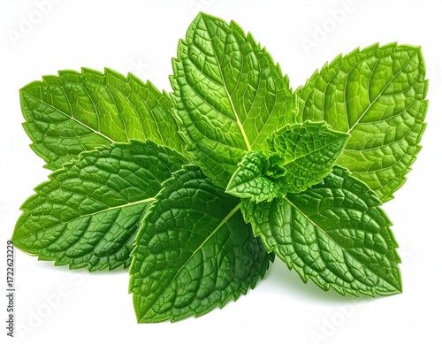 A close-up showcases vibrant green mint leaves clustered together against a stark white background, highlighting their intricate vein patterns