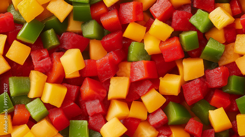 a close-up, top-down view of diced bell peppers spread across the entire frame, filling the image with vibrant red, yellow, and green colors in uniform cubes
