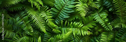 A close-up top-down view of lush green ferns and tropical plants with dew drops