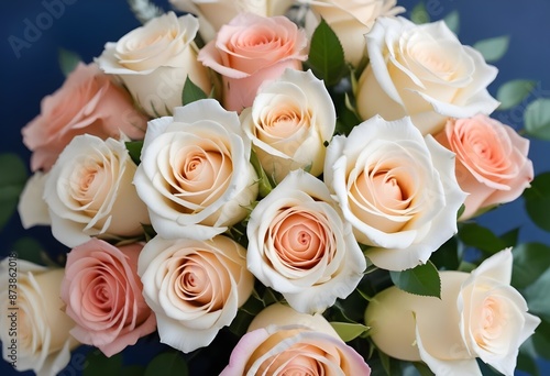 A close-up view of a bouquet of beautiful white and peach roses with soft, delicate petals arranged in a lush, floral pattern