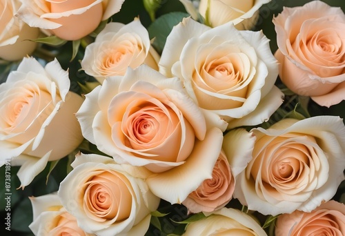 A close-up view of a bouquet of beautiful white and peach roses with soft, delicate petals arranged in a lush, floral pattern, blue, pink, purple, white roses