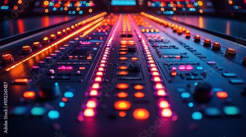 A close-up view of a control panel with rows of glowing buttons and knobs.