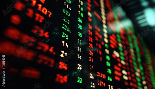 A close-up view of a digital stock market display, featuring fluctuating numbers in red and green, indicating stock prices and market changes.