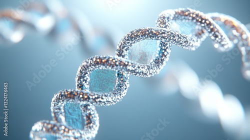 A close-up view of a DNA double helix structure, showcasing its intricate design and shimmering details against a soft blue background.