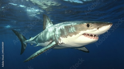 A close-up view of a great white shark swimming underwater.