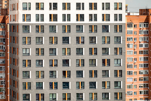 A close-up view of a modern apartment building's facade showcasing various window designs and colors