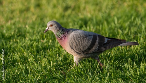 A close-up view of a rock pigeon strolling on lush green grass, showcasing its plumage and natural habitat