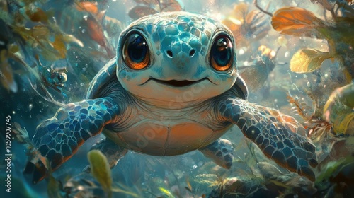sea, turtle, ocean, water, animal, underwater, shell, green, blue, brown, closeup, creature, wildlife, nature, aquatic, life, scale, eye, cute, small, young, painting, art, digital, illustration, fin, flipper, snout, mouth, head, swimming, happy, bright, light, background, blur, depth, detail, soft, sharpened, vibrant, colours, pattern, texture, smiling, cheerful, playful