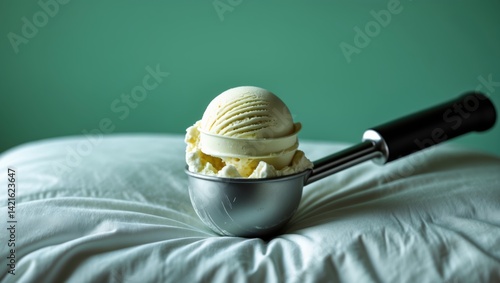 A close-up view of a stainless steel ice cream scoop filled with creamy vanilla ice cream on a soft white surface, evoking a soothing and refreshing atmosphere.