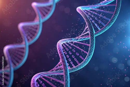 A close-up view of a transparent, twisting abstract structure resembling a DNA double helix with a grid-like pattern, rendered in shades of purple and blue - generated by ai