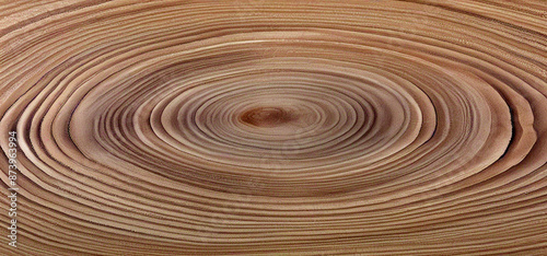 A close-up view of a tree trunk cross-section, revealing detailed growth rings that radiate outward from the center.