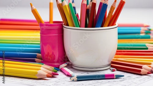 A close-up view of a variety of colored pencils arranged in a metal cup