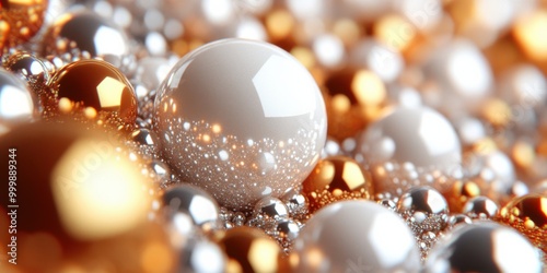 A close-up view of a white sphere nestled among a bed of shimmering metallic spheres, creating a dazzling and abstract pattern.