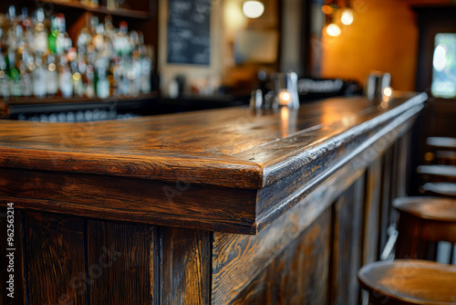 A close-up view of a wooden bar counter in a cozy establishment, showcasing a warm atmosphere for social gatherings.