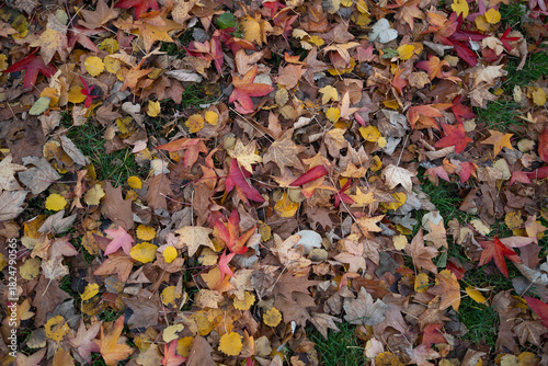 A close-up view of colorful autumn leaves in shades of red, yellow, and brown scattered on the green grass, creating a beautiful fall ground cover