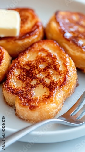 A close-up view of crispy French toast topped with melting butter, creating a tempting visual of this favorite breakfast dish elevating the senses.