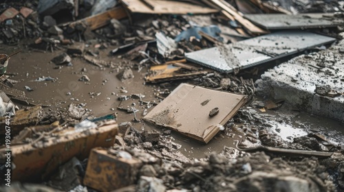 debris, construction, ground, wood, cardboard, scattered, material, disaster, mess, wreckage, dirt, ruin, damaged, remnant, cleanup, urban, environment, chaos, destruction, waste, removal, broken, discarded, untidy, disorder, industrial, site, debris, dilapidated, messy, fallen, piece, grime, remain, shattered, fragment