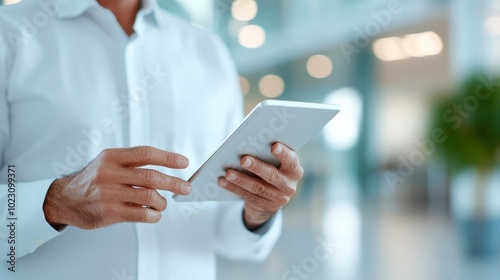 A close-up view of hands holding a tablet indoors, depicting focus and interaction with technology in a modern setting, with a blurred background.