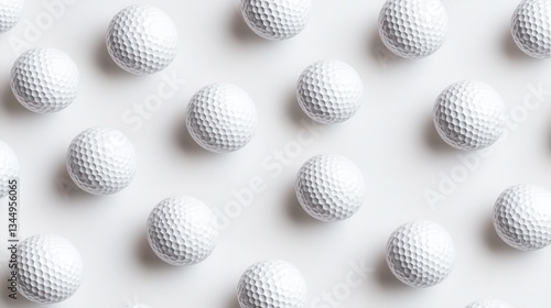 A close-up view of multiple white golf balls arranged evenly on a surface, showcasing their textured dimples and uniformity.