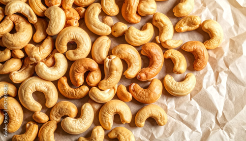 A close-up view of roasted cashew nuts, featuring a slightly cracked texture, scattered on parchment paper.