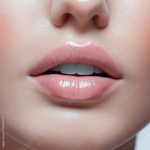 A close-up view of smooth, glossy lips with natural makeup reflecting light beautifully.