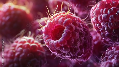 A close-up view reveals the intricate details of a cluster of ripe raspberries, showcasing their vibrant red hue and velvety texture.