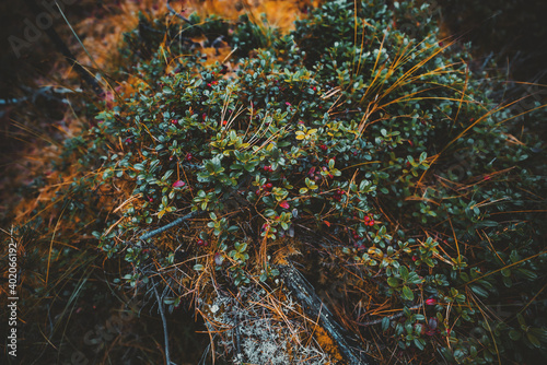 A close-up view with a shallow depth of field of a low evergreen shrub of a lingonberry with red berries in a deep taiga forest surrounded by different moss and conifer needles on the ground
