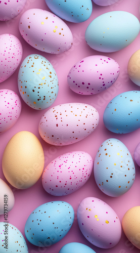 A close-up wallpaper featuring an Easter candy egg pattern in pastel colors, showcasing Easter decorations and sweet treats.Minimal creative holiday food concept.Copy space,flat lay