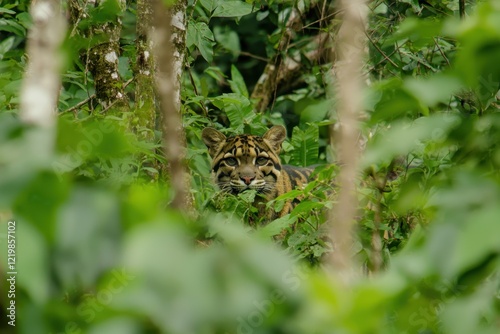 A clouded leopard stealthily moving through the dense foliage of a Southeast Asian jungle, its eyes keen and alert