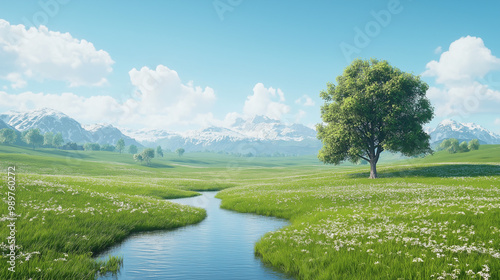 a cloudless sky , A small river separates the short green grass from the middle. A neat, clustered tree on one side of the lawn realistic.