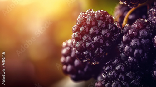 a cluster of blackberries with a shiny surface and dew droplets against an isolated warm-toned background