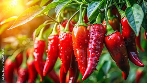 A cluster of bright red chili peppers, glistening with water droplets, hang from a lush green plant, illuminated by a warm sunbeam.