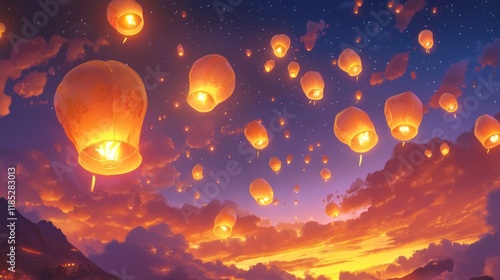 A cluster of glowing Chinese paper lanterns floating in the night sky