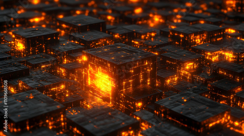 A cluster of illuminated blocks on a dark circuit background, showcasing a glowing digital storage system.