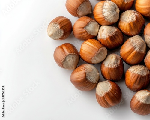 A cluster of shiny, brown hazelnuts scattered on a light background, showcasing their smooth texture and distinct shape.
