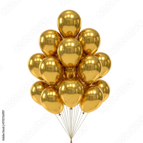 A cluster of shiny golden balloons arranged in a festive bouquet isolated on transparent background