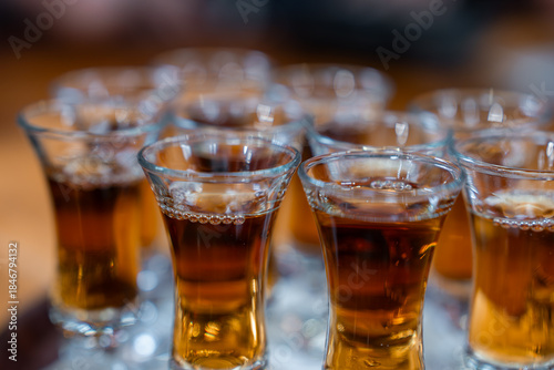A cluster of small flared shot glasses holds amber liqueur in Funchal, rims beaded with bubbles, sharp front focus and creamy bokeh suggest a festive tasting mood.